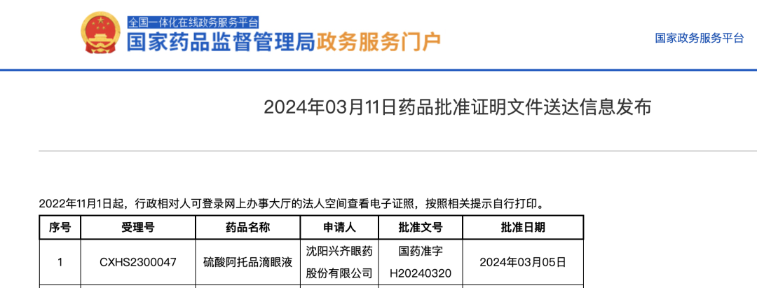 2024年3月11日,国家药监局公示显示硫酸阿托品滴眼液新药上市申请已获得批准 。2026年1月,0.02%与0.04%浓度硫酸阿托品滴眼液获得国家药监局批准上市。